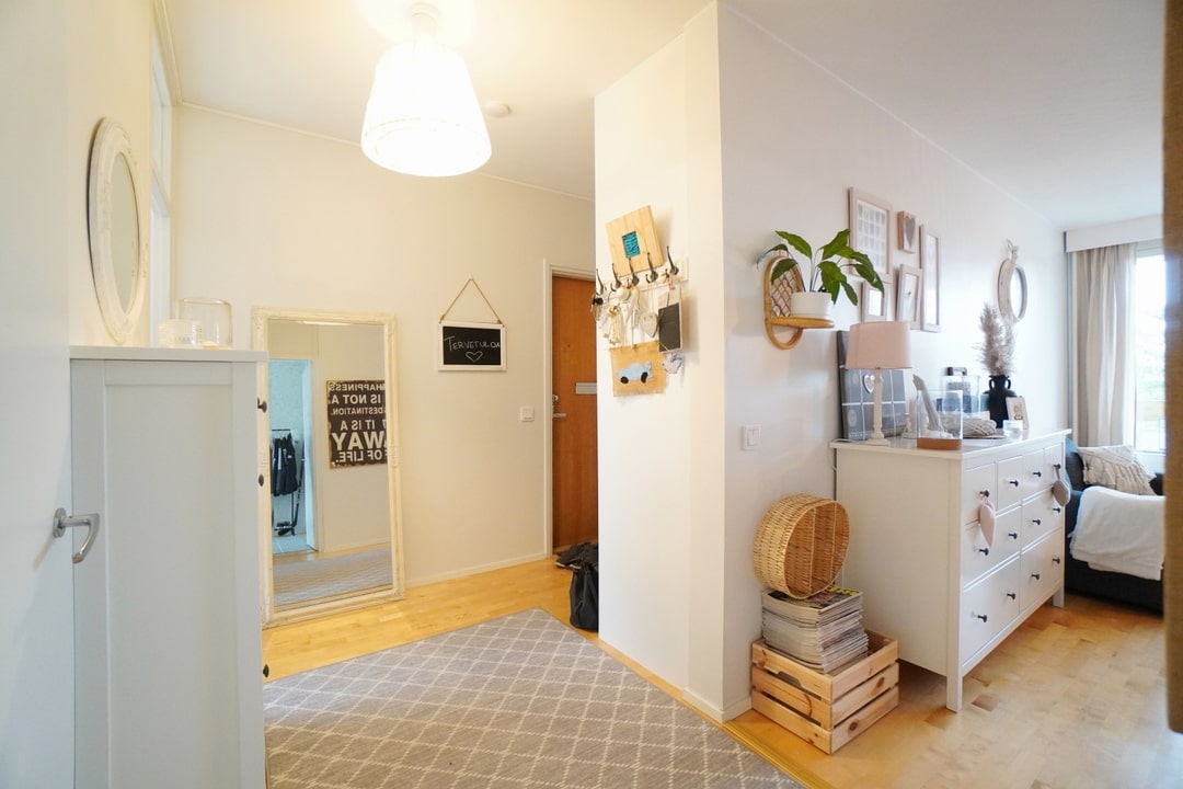 Valoisa ja tilava kaksio, jossa lattiat ovat kestävää parkettia ja seinäpinnat vaaleat.