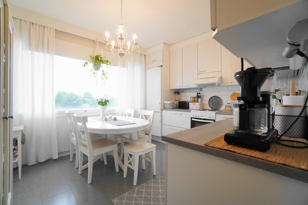 Keittiö on kauttaaltaan siistissä kunnossa. Kodikkaasta keittiöstä löytyy paljon kaapistoja ja hyväkuntoiset kodinkoneet, mukaan lukien astianpesukone.