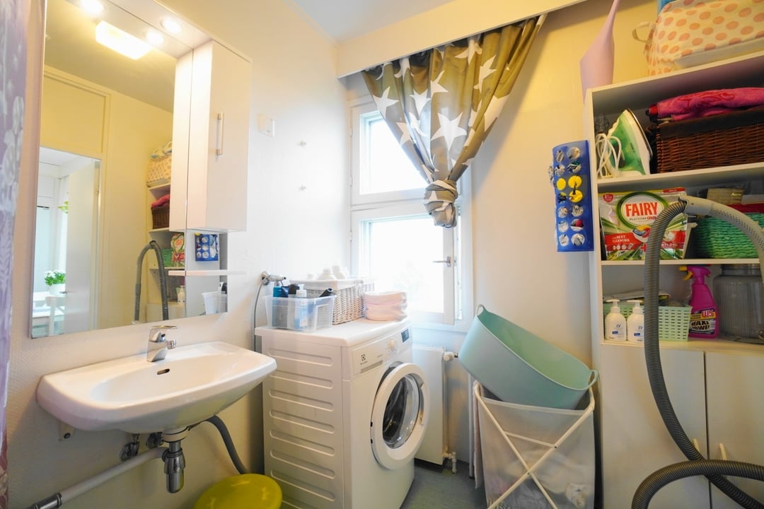 Reilun kokoinen kylpyhuone, jossa on paikka pesukoneelle. Asunnossa on erillinen wc.