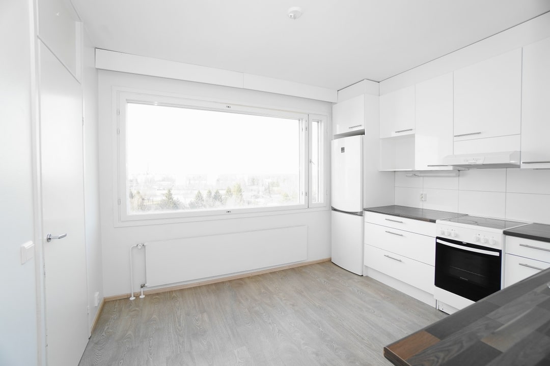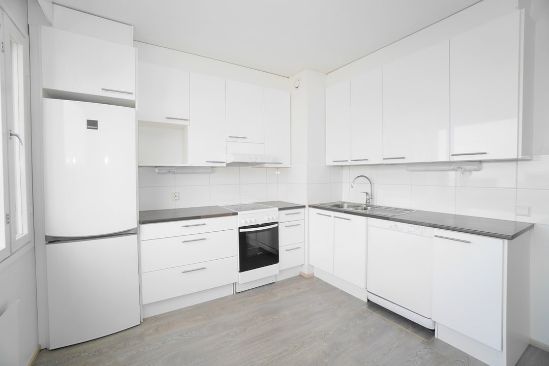 erillinen keittiö, laminaattitasot keittiössä, sähköliesi; liesituuletin, astianpesukone (60cm), jääkaappipakastin, tilaa isolle ruokapöydälle; paljon kaappitilaa; paljon työskentelytilaa; mikrohylly