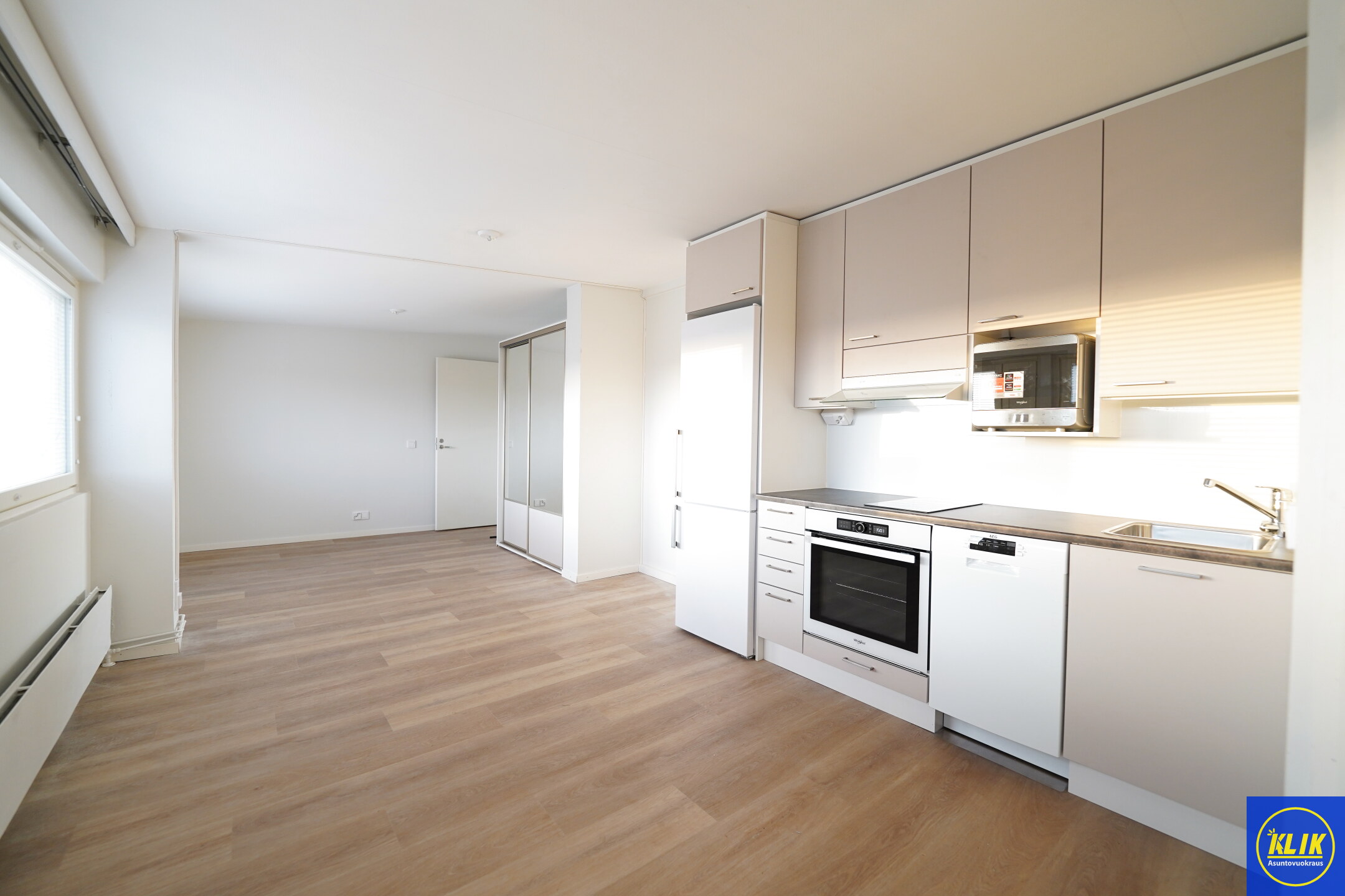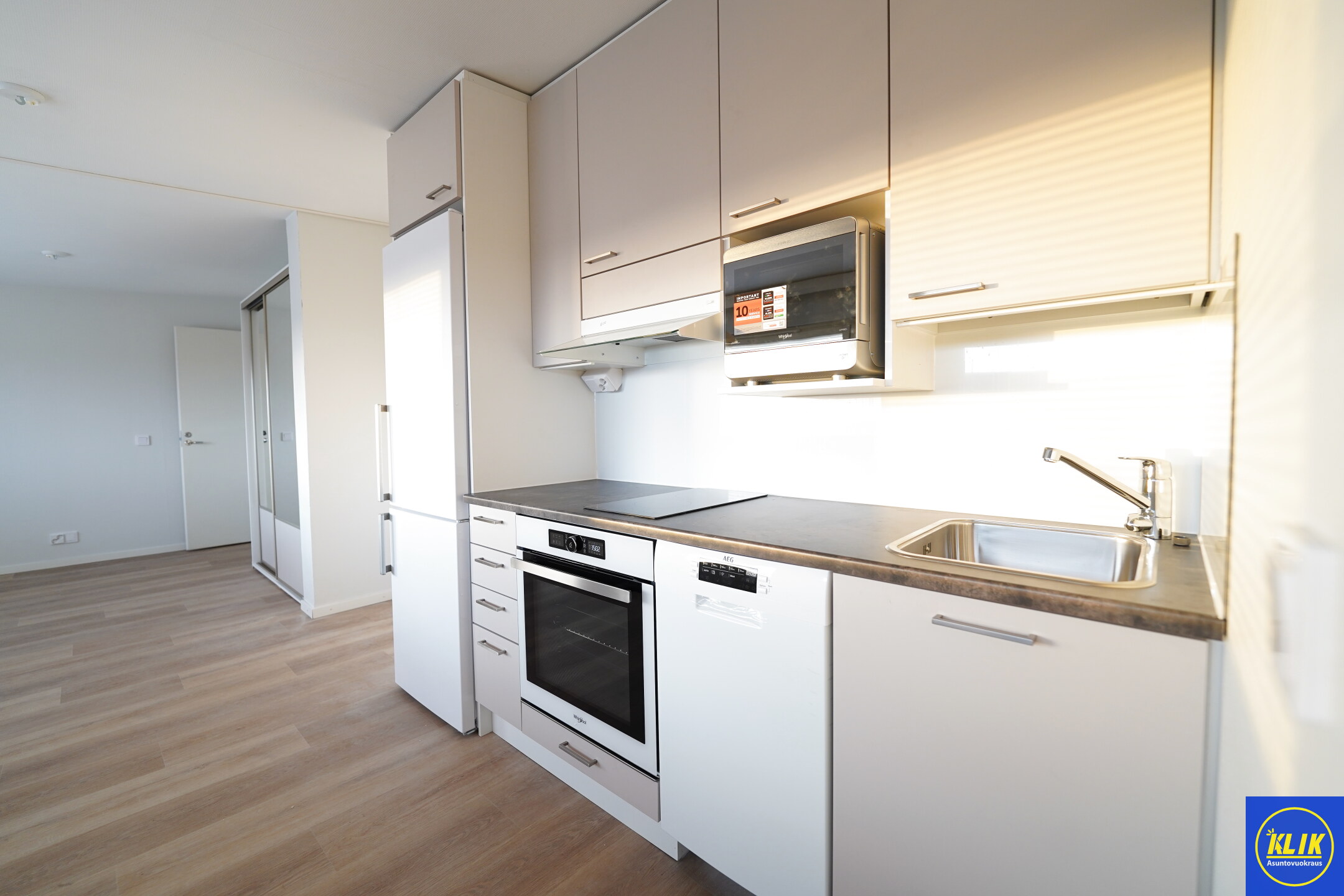 avokeittiölaminaattitasot keittiössä, keraaminen- tai induktioliesi; keittotaso ja kalusteuuni; liesituuletin, astianpesukone (45cm), jääkaappipakastin, mikro valmiina keittiössä; mikrohylly