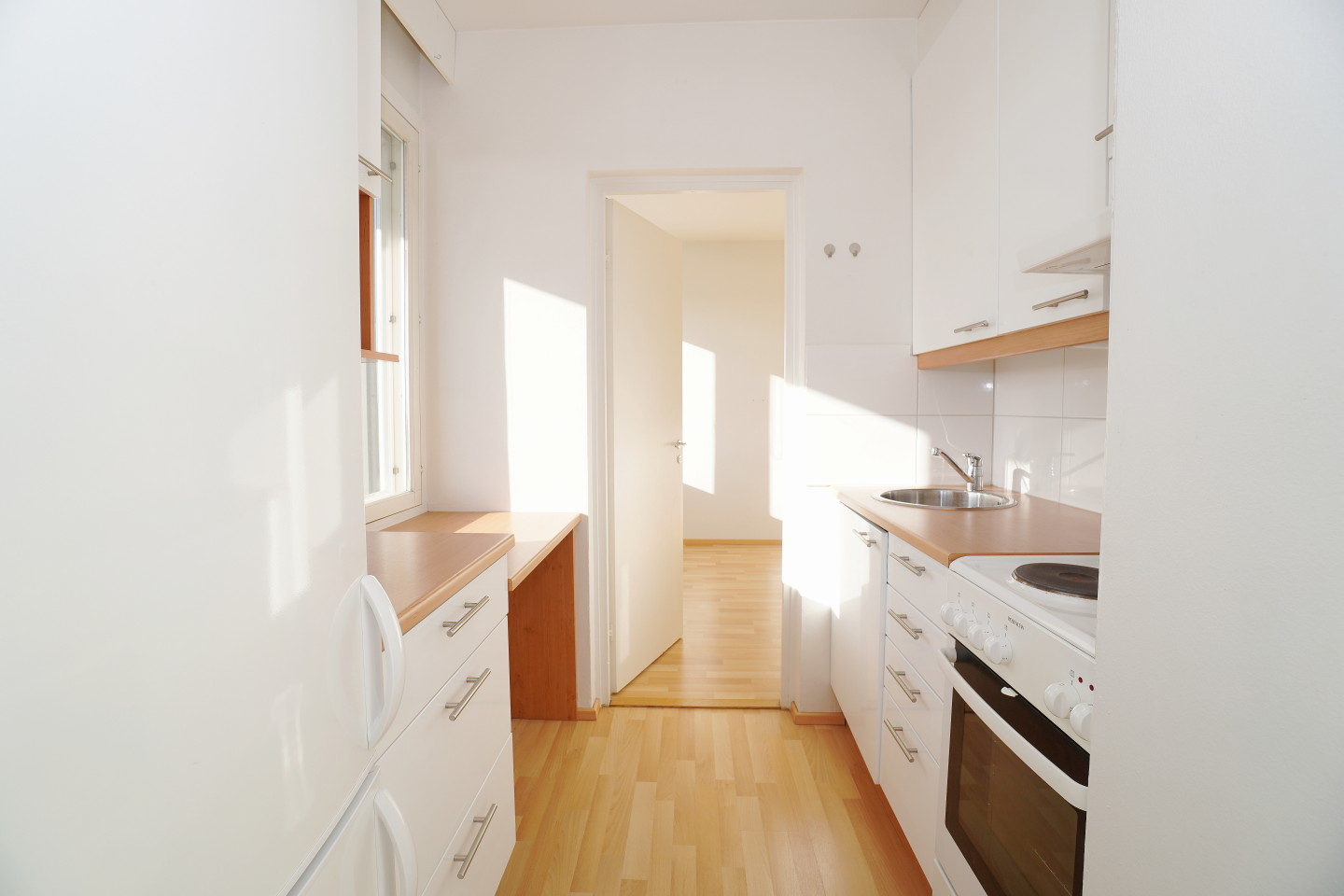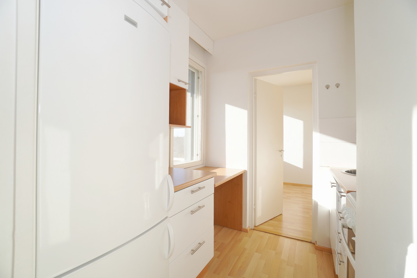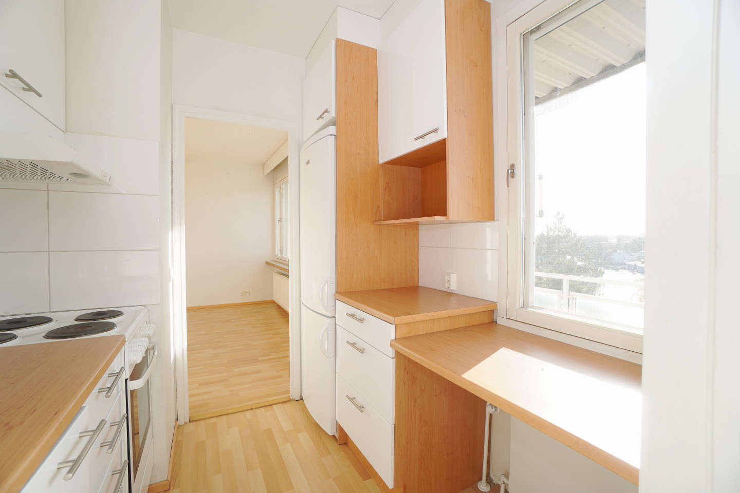 erillinen keittiölaminaattitasot keittiössä, sähköliesi; liesituuletin, jääkaappipakastin, tilaa isolle ruokapöydälle; paljon kaappitilaa; paljon työskentelytilaa; mikrohylly