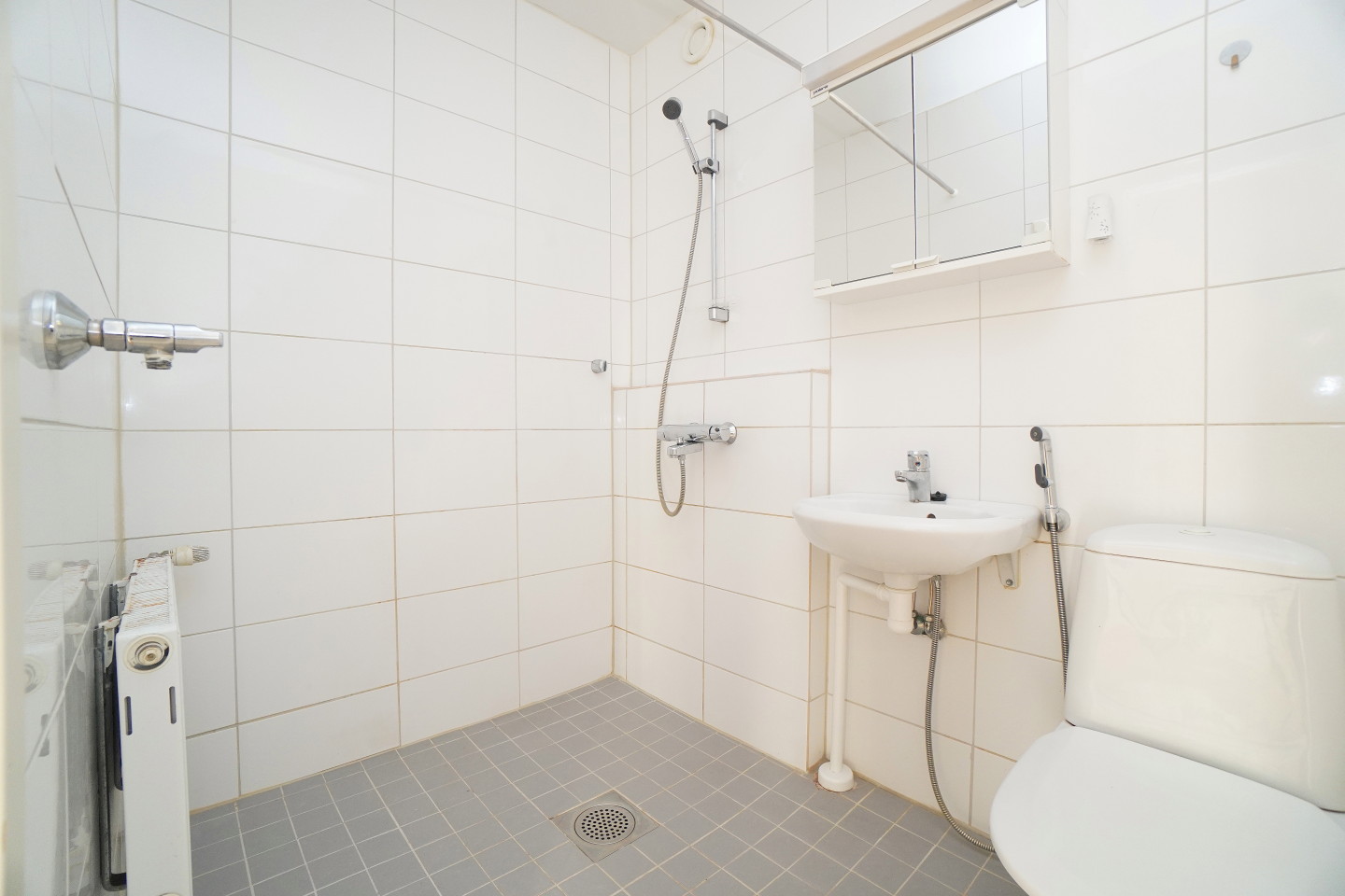laattalattia; laattaseinä, peilikaappi, suihku, pesukonevalmius, taloyhtiössä sauna