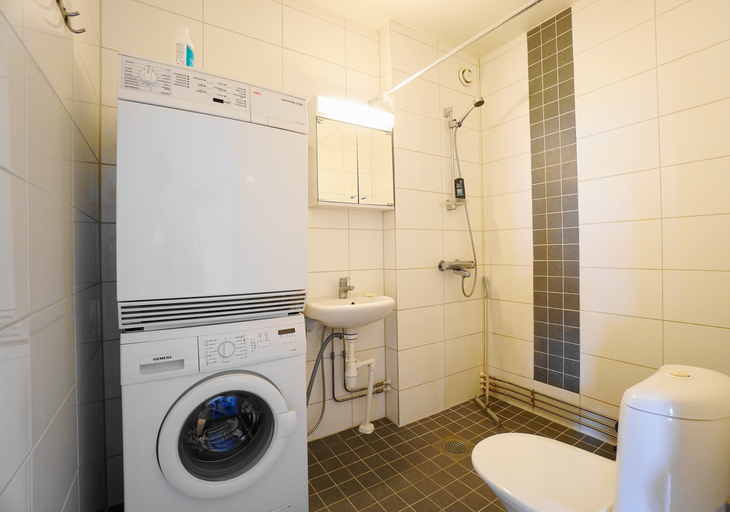 laattalattia; laattaseinä, peilikaappi, suihku; suihkuseinä, pesukonevalmius