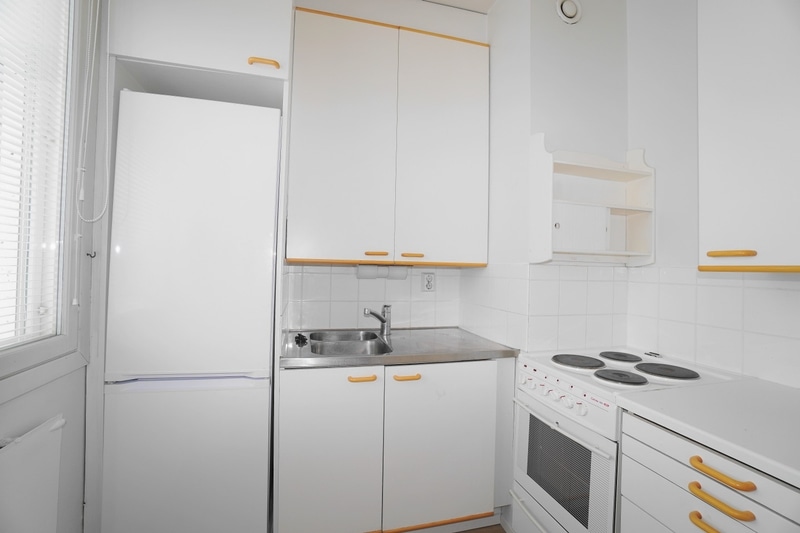 keittokomero, laminaattitasot keittiössä, sähköliesi; liesituuletin, jääkaappipakastin, tilaa isolle ruokapöydälle; paljon kaappitilaa