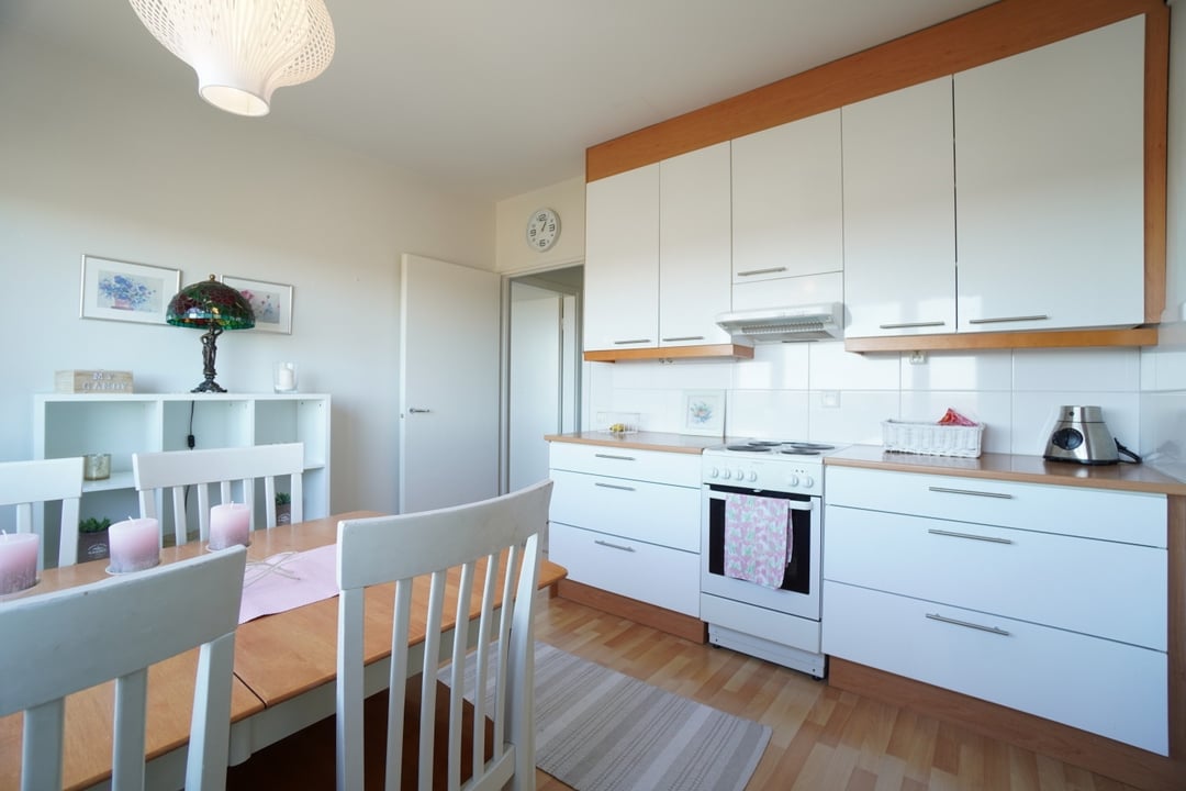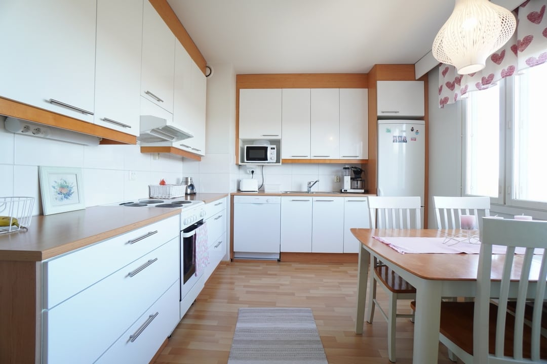 erillinen keittiö, laminaattitasot keittiössä, sähköliesi; liesituuletin, astianpesukone (60cm); pesukoneliitos, jääkaappipakastin, tilaa isolle ruokapöydälle; paljon kaappitilaa; paljon työskentelytilaa