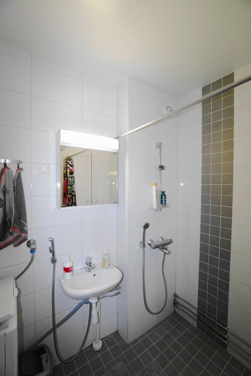 laattalattia; laattaseinä, allaskaappi; peilikaappi, suihku, pesukonevalmius