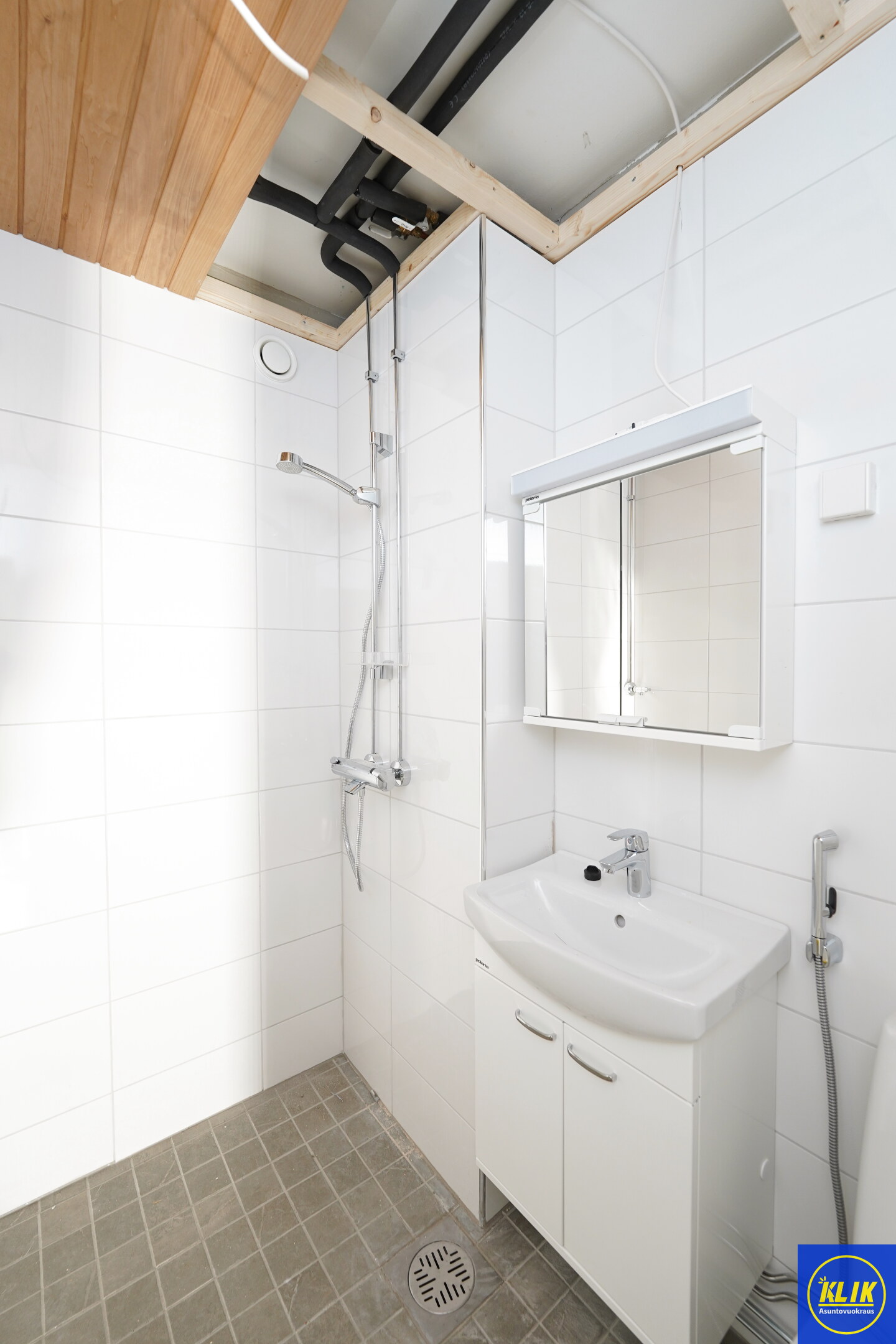 laattalattia; laattaseinä, allaskaappi; peilikaappi, suihku; suihkuseinä, pesukonevalmius; taloyhtiössä pesutupa; taloyhtiössä kuivaushuone, kylpyhuoneessa lattialämmitys; taloyhtiössä sauna