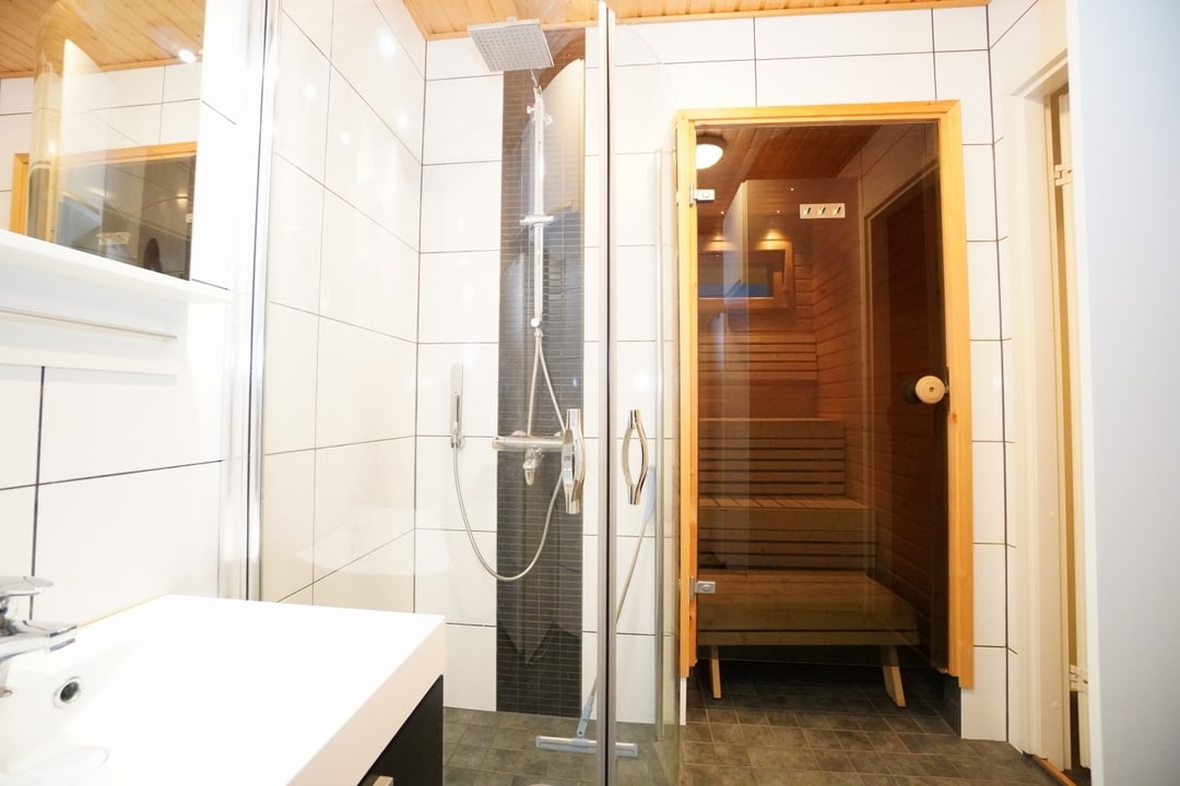 Kylpyhuone on tilava ja myös täällä toistuvat harmaan ja valkoisen sävyt. Oma sauna kruunaa kokonaisuuden.