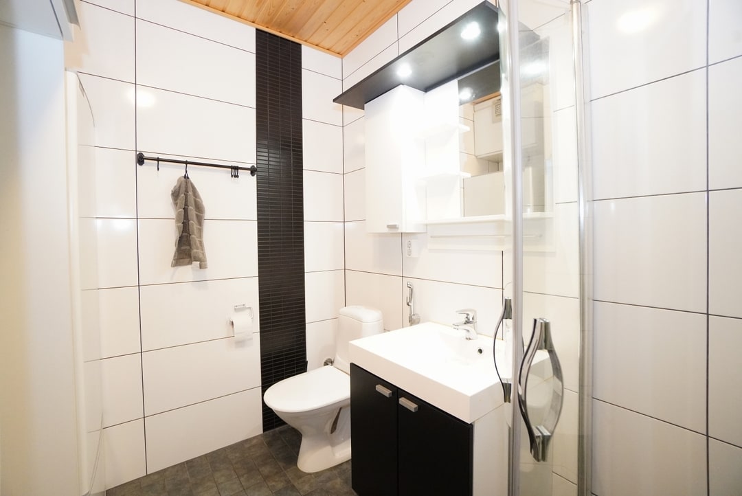 laattalattia; laattaseinä, allaskaappi; peilikaappi, suihku; suihkuseinä, pesukonevalmius, lattialämmitys; sauna; avattava ikkuna
