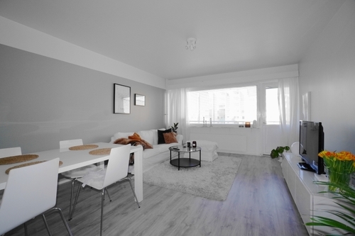 Valoisa ja paljon remonttia kokenut asunto kaikkien palveluiden ääreltä. Keittiö on siisti ja kodinkoneet hyväkuntoiset. Astianpesukone löytyy ja kaappitilaa on hyvin. Isosta olohuoneesta on käynti lasitetulle parvekkeelle, joka on sisäpihalle päin. Lattiassa siisti harmaansävyinen laminaatti ja seinät on maalattu. Makuhuone on tilava ja siellä on peiliovikaapistot säilytystä varten. Eteisessä on runsaasti lisää kaappitilaa. Kylpyhuone on laatoitettu ja pesukoneelle on paikka.