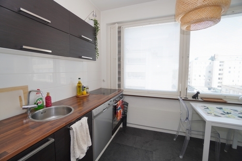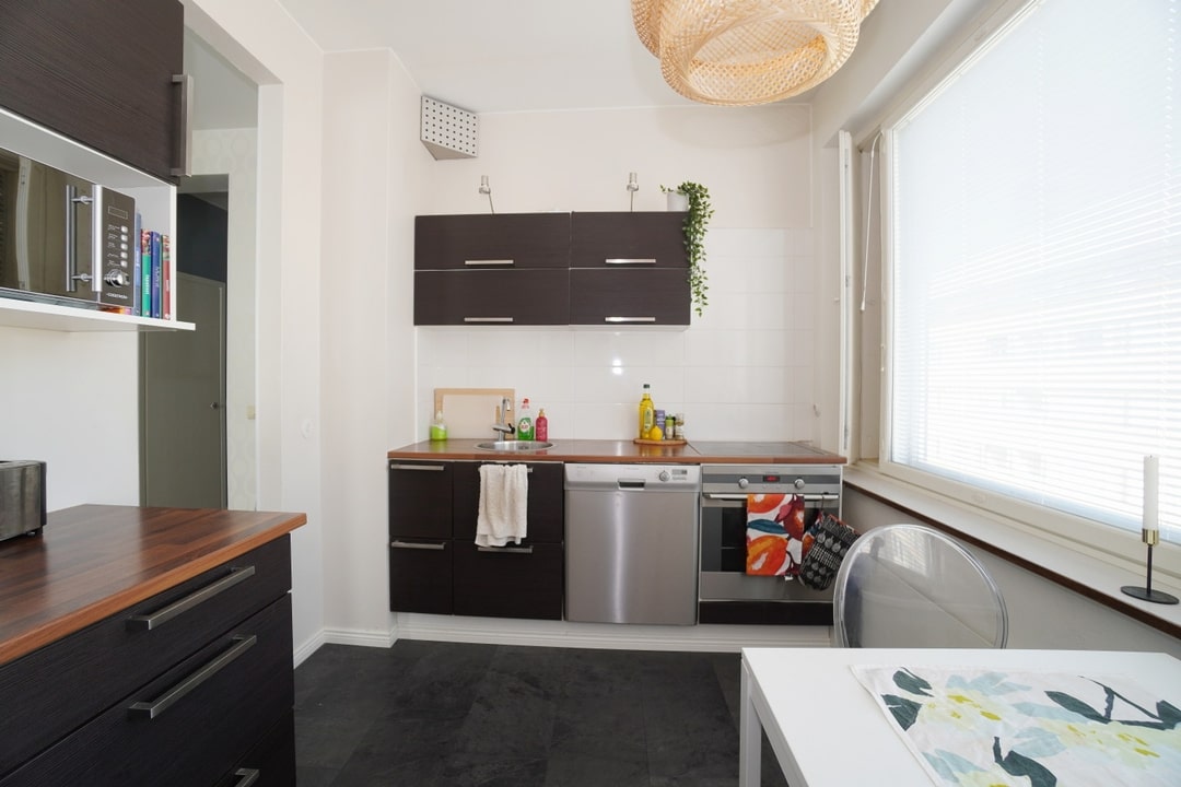 Äskettäin uusitussa tyylikkäässä keittiössä astianpesukone, kalusteuuni + keraaminen keittotaso sekä jääkaappipakastin. Kaikki kodinkoneet hyvässä ja siistissä kunnossa. Kaakeloitu wc, jossa paikka pyykinpesukoneelle.