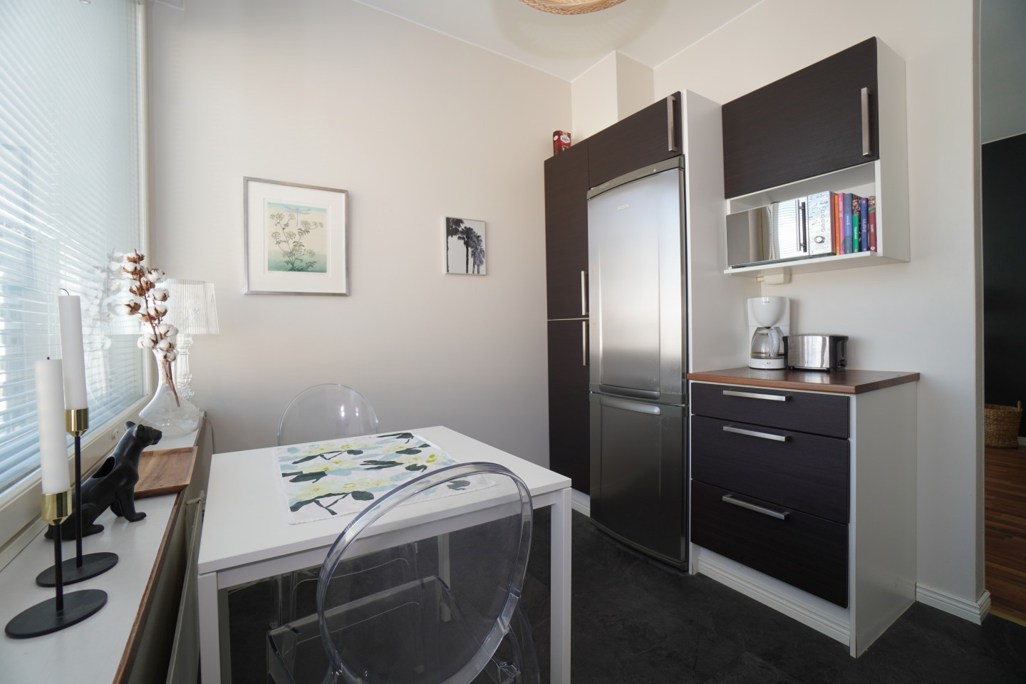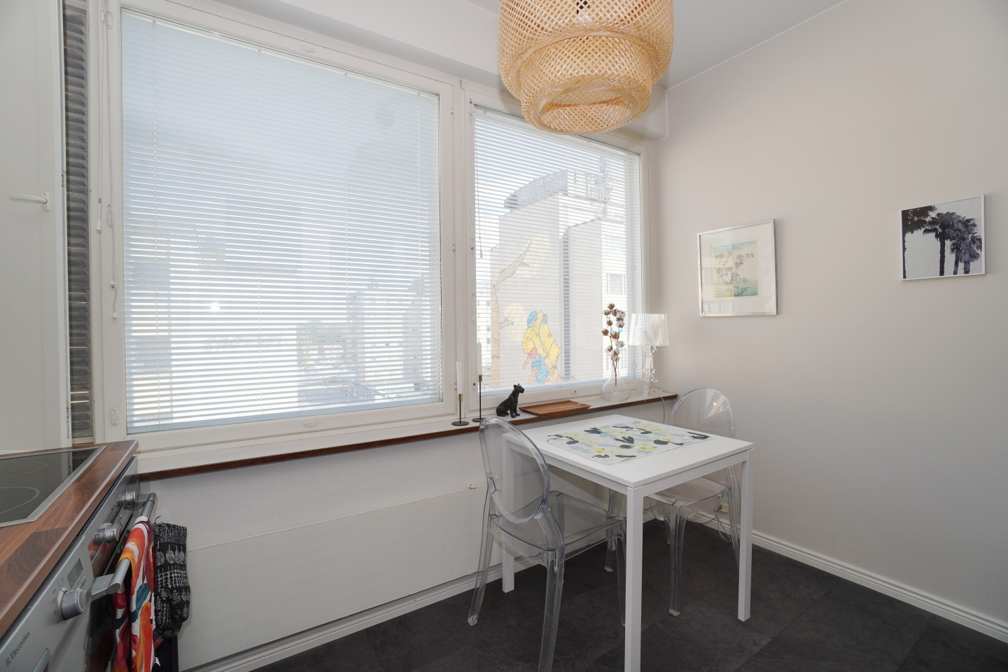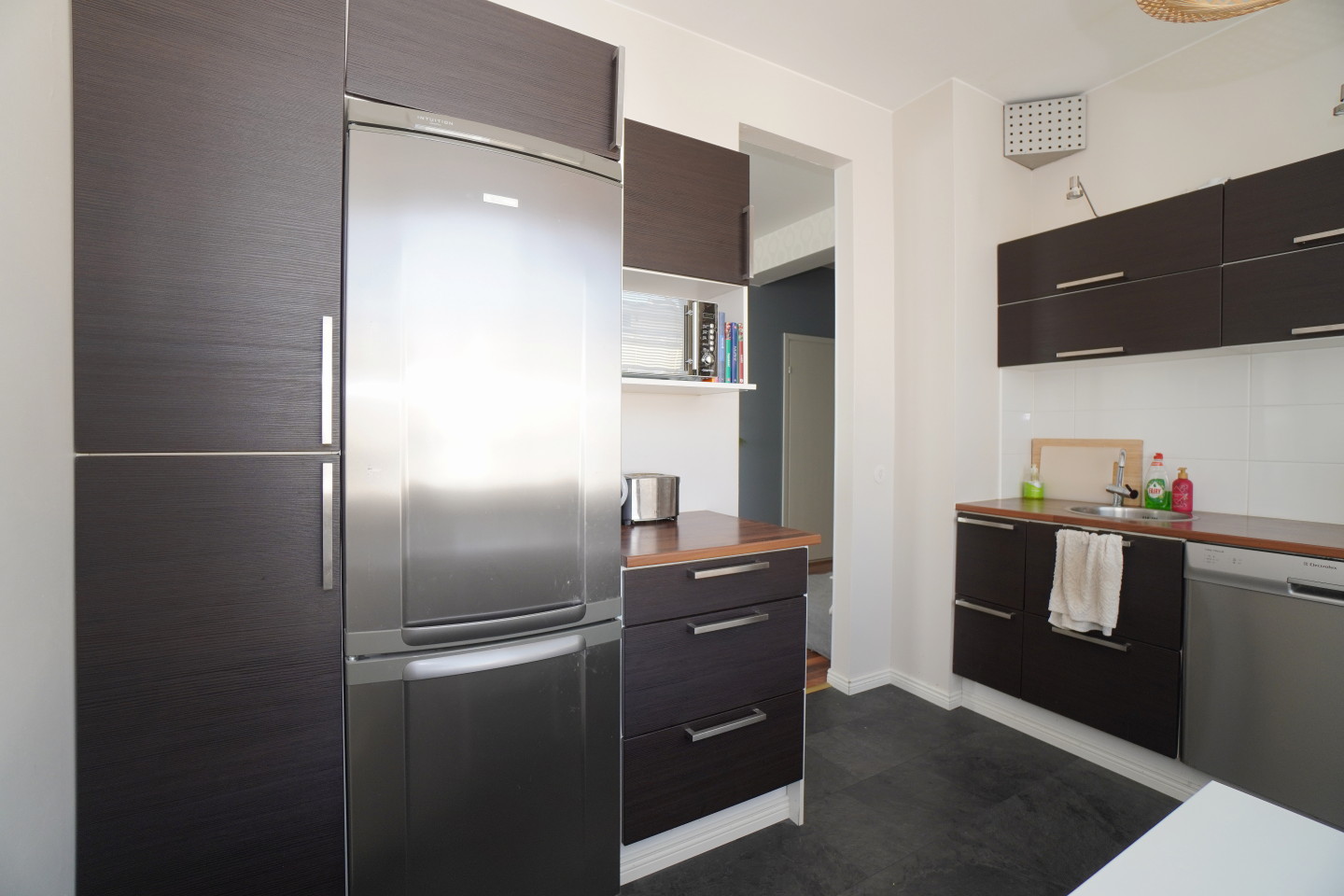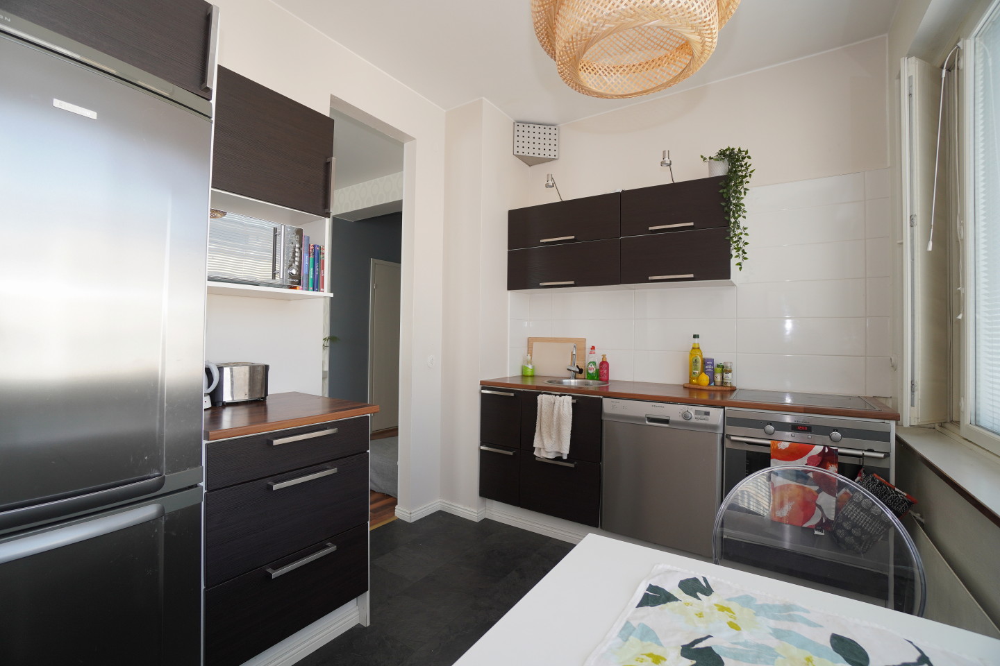 erillinen keittiölaminaattitasot keittiössä, keraaminen- tai induktioliesi; liesi ja uuni erikseen, astianpesukone (60cm), jääkaappipakastin, mikrohylly